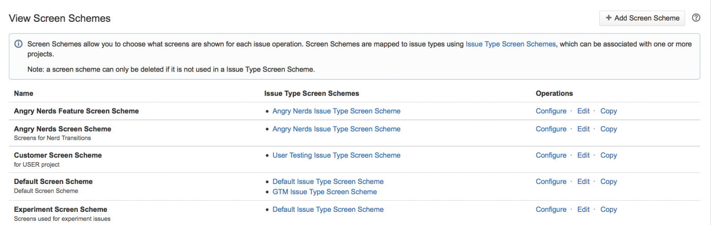 В схеме экрана вы можете указать один и тот же экран (или выбрать разные экраны) для этих операций с задачами. После того, как вы создали схему экрана, вам необходимо активировать его, связав схему экрана с типами задач с помощью «схемы экрана типа задачи». (В свою очередь, схемы экрана типа задачи связаны с проектами JIRA.)