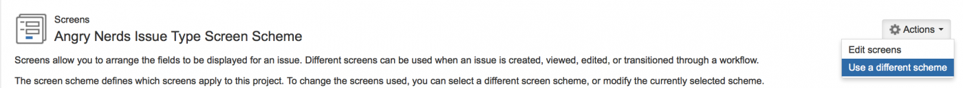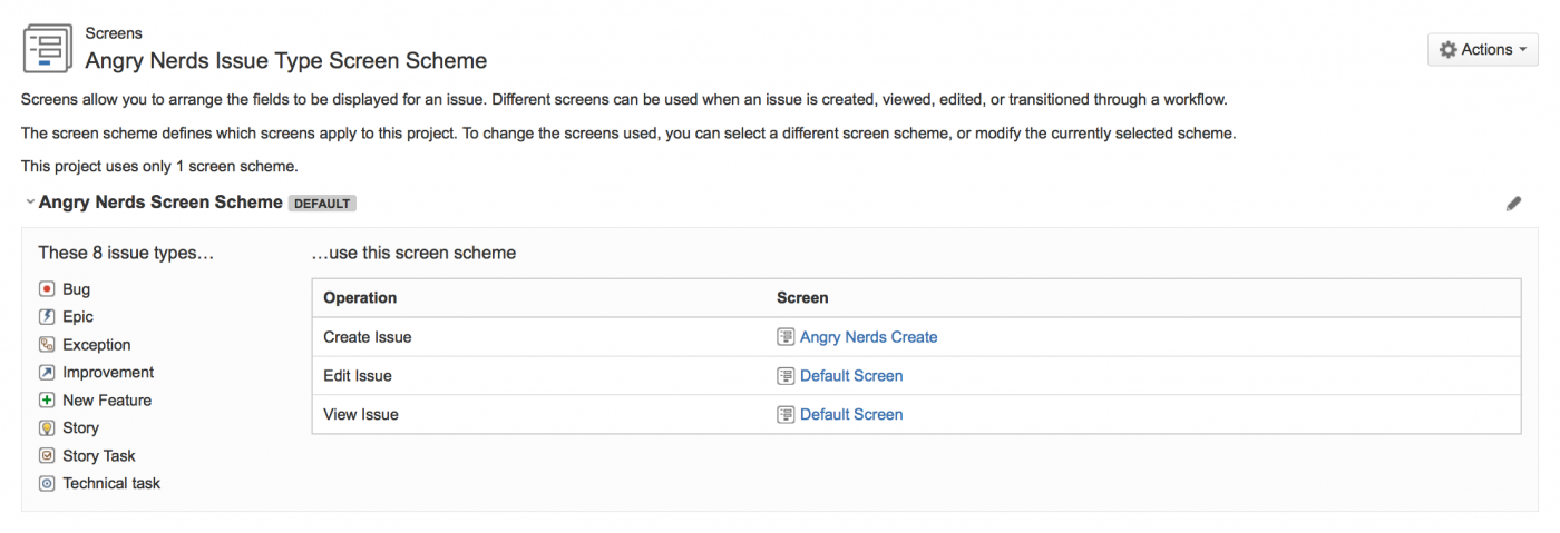 - Нажмите ссылку «Настроить» (Configure) рядом с требуемой схемой экрана типа задачи, которая открывает страницу «Настройка схемы экрана типа задачи» (Configure Issue Type Screen Scheme) :