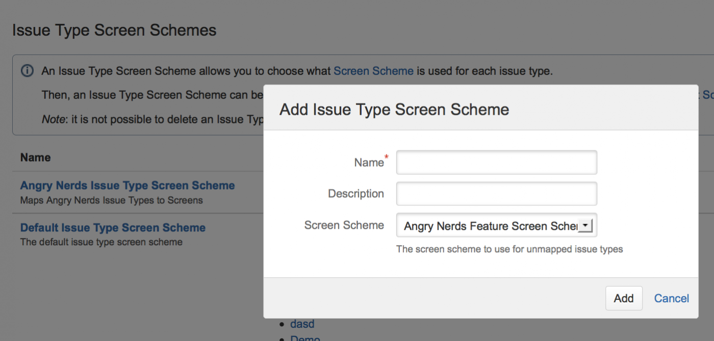 - Нажмите кнопку «Добавить схемы экрана типа задачи» (Add Issue Type Screen Scheme), чтобы открыть эту страницу: