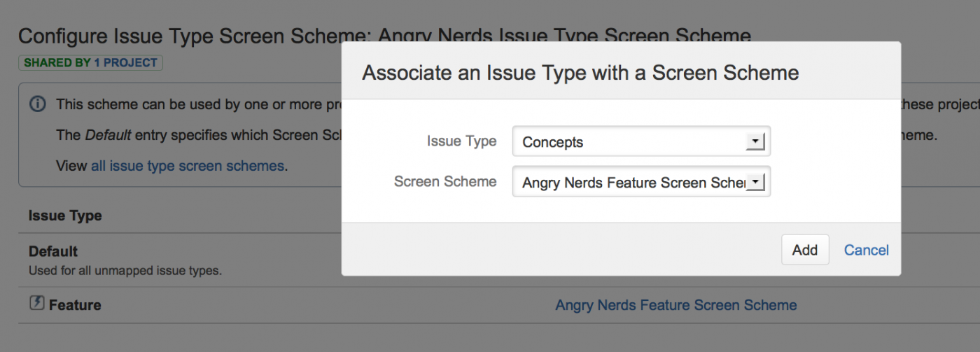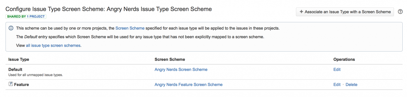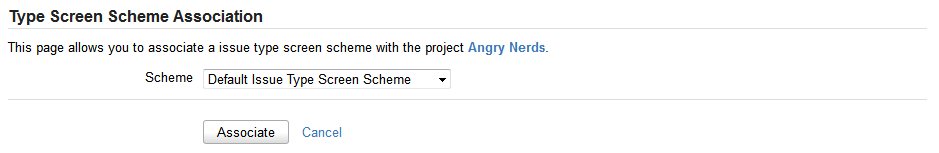 - Нажмите «Связать тип задачи с схемой экрана» (Associate an issue Type with a Screen Scheme), которая отобразит этот экран: