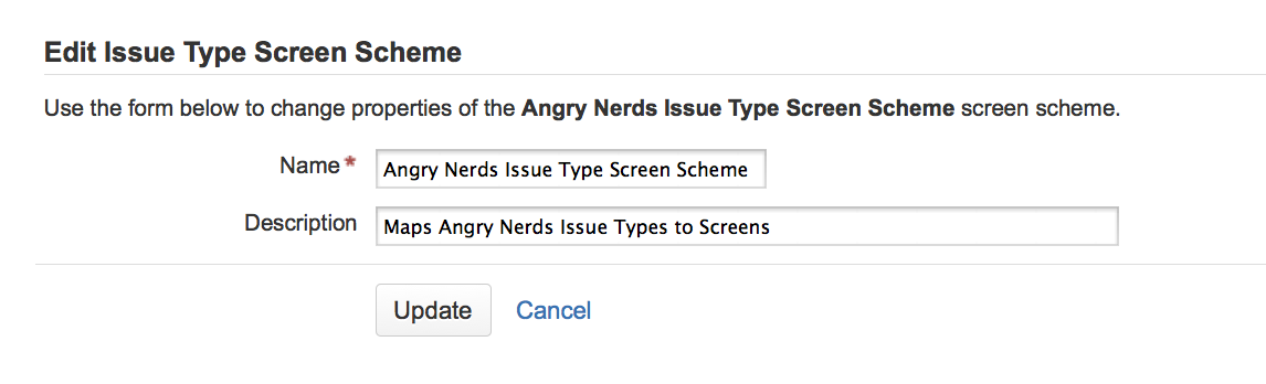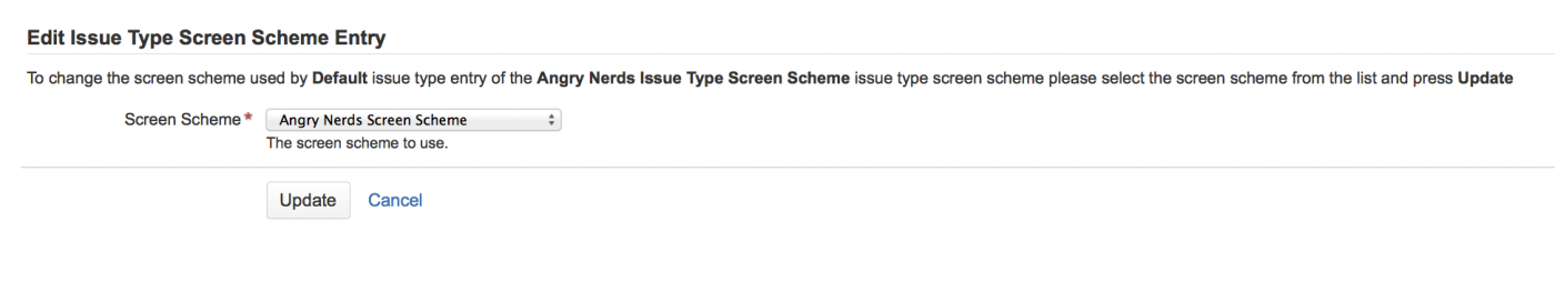 - Нажмите кнопку «Обновить» (Update), которая вернет вас на страницу «Просмотр схем экрана типа задачи » (View Issue Type Screen Schemes), и теперь ваши обновления теперь применяются к списку схем экрана типов задач.