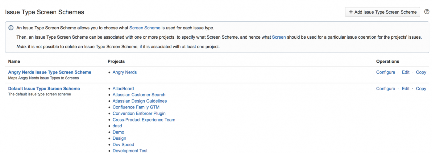 Для каждого типа задачи может быть только одна ассоциация. Если все типы проблем связаны с «Схемой экрана, вы можете использовать ссылку «Редактировать» (Edit) рядом с каждой записью, чтобы изменить схему экрана, которая связана с ней.