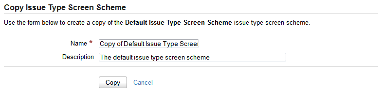 - Нажмите ссылку «Копировать» (Copy) рядом с экраном поля, которое вы хотите скопировать, и откроется страница «Копировать схему экрана типа задачи» (Copy Issue Type Screen Scheme).