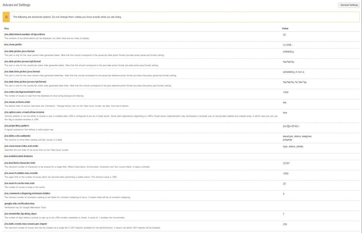 JIRA имеет небольшое количество часто редактируемых расширенных параметров конфигурации, которые хранятся в базе данных JIRA. Эти параметры доступны и отредактированы на странице «Расширенные настройки» (Advanced Settings). Для этого вы должны быть системным администратором JIRA.