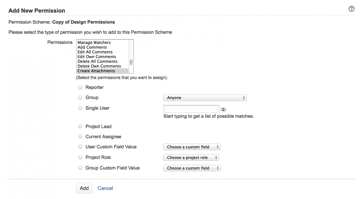 - схемы разрешений, используемые вашим проектом (-ами), уже имеют разрешения «Создание вложений» (Create Attachments) (и «Удалить собственные вложения» (Delete Own Attachments)) или
