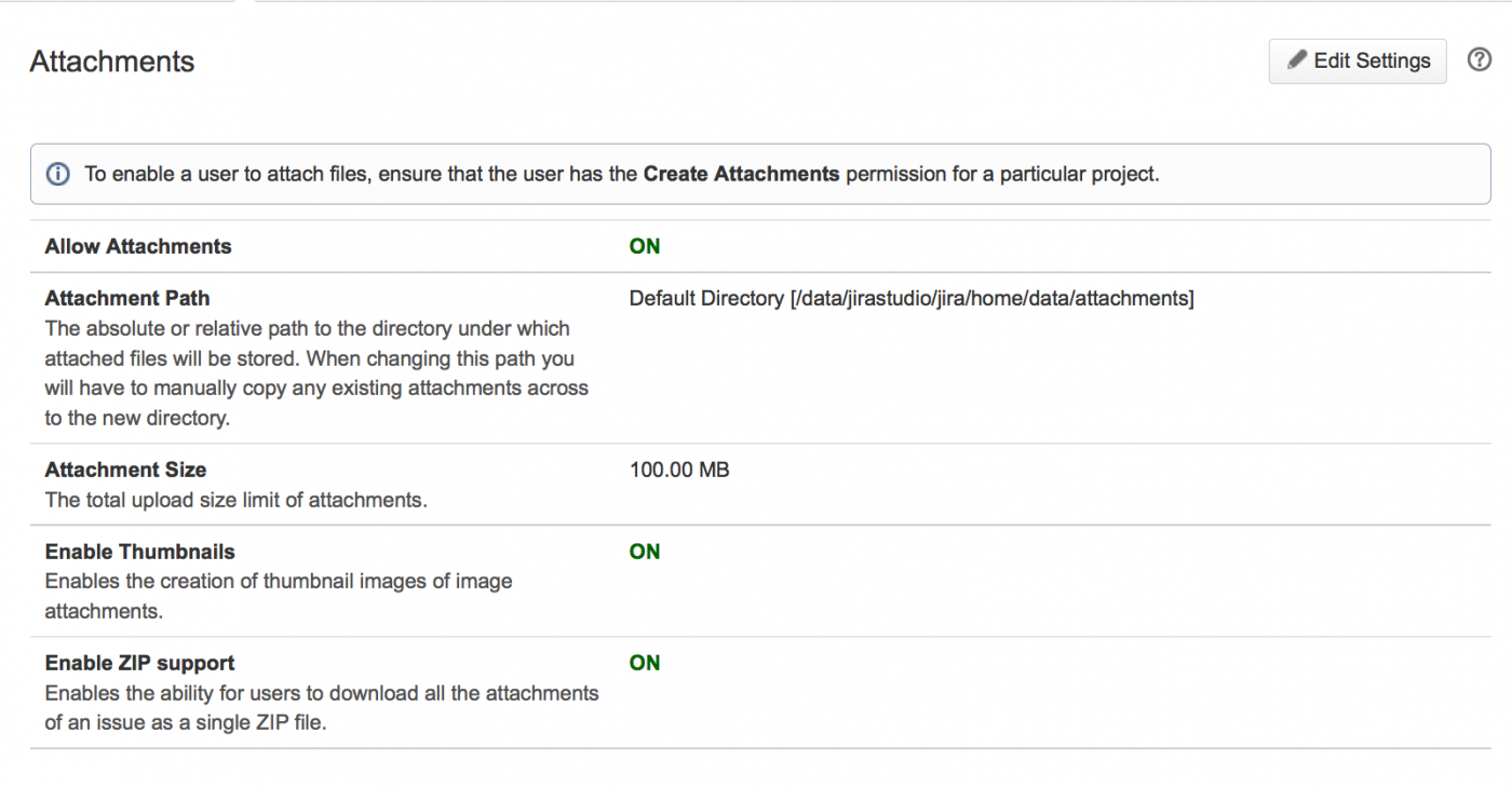 Когда вложения файлов включены, вашим пользователям будет разрешено прикреплять файлы и скриншоты к задачам JIRA. Для хранения вложений требуется пространство на сервере.