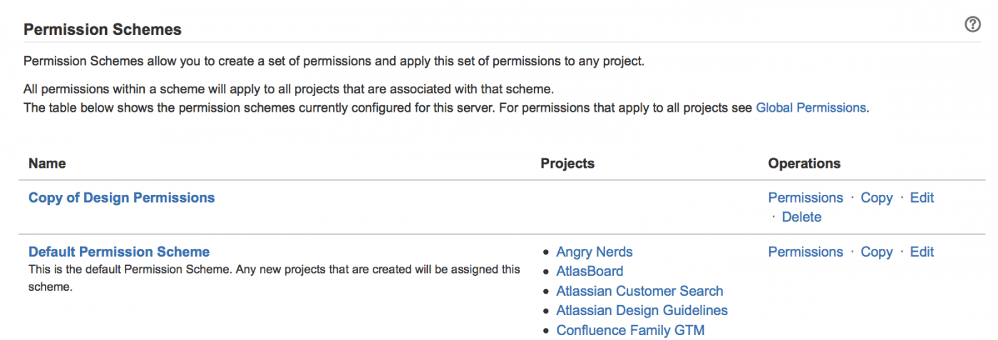1. Выберите > «Задачи» (Issues). Выберите «Схемы разрешений» (Permission Schemes), чтобы открыть страницу «Схемы разрешений», которая отображает список всех схем разрешений в вашей системе JIRA и проектах, которые используют каждую схему.