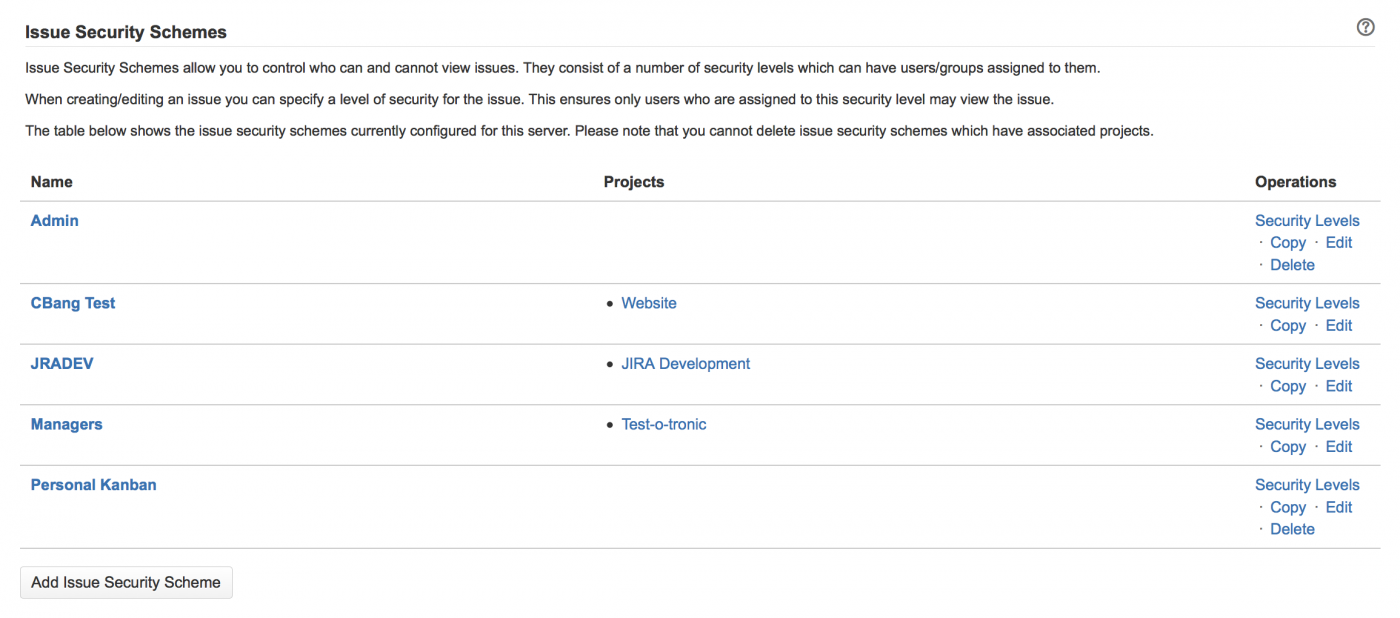 - Нажмите название любой схемы или ссылку «Уровни безопасности» (Security Levels) (в столбце «Операции» (Operations )), чтобы открыть страницу «Изменить уровни безопасности задач» (Edit Issue Security Levels).