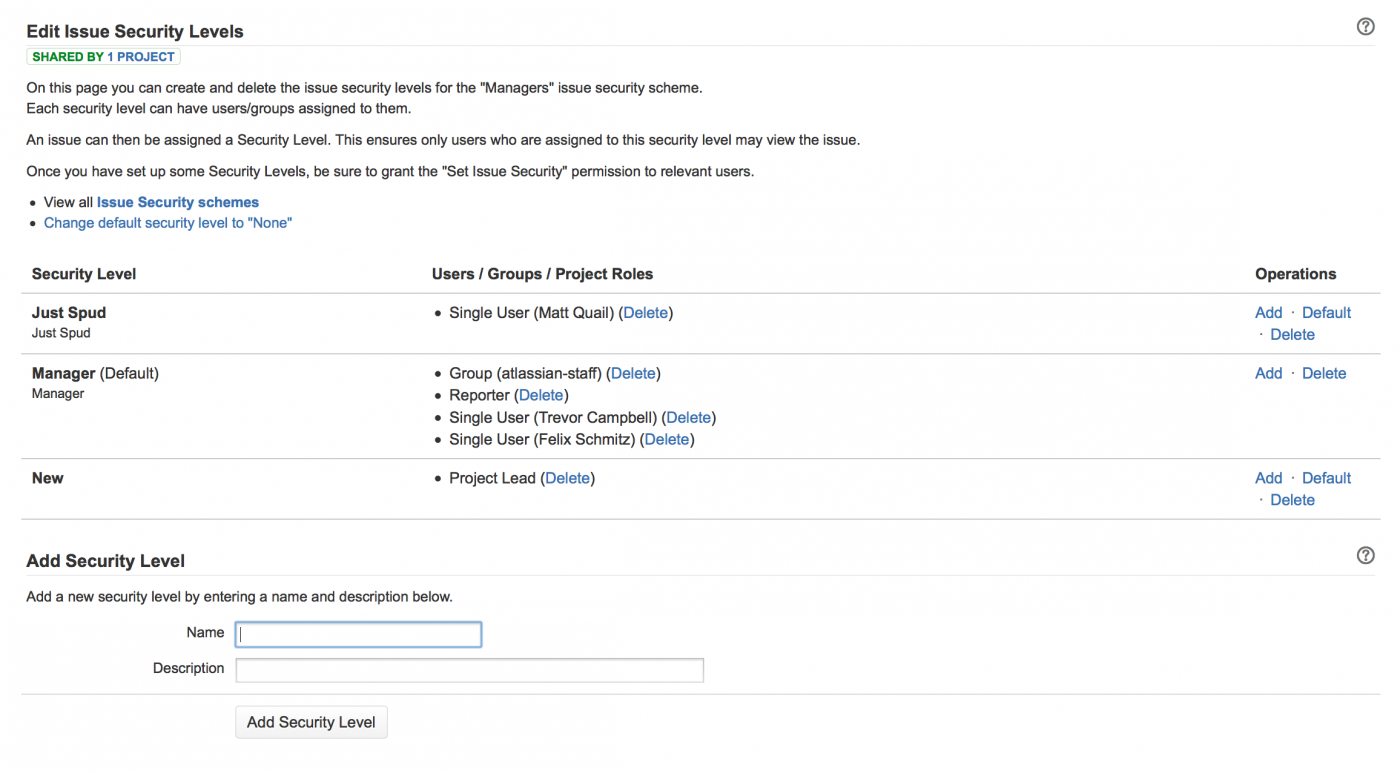 Уровень безопасности по умолчанию используется при создании задач. Если у репортера задачи нет разрешения «Установить безопасность задач »(Set Issue Security), тогда уровень безопасности задачи будет установлен на уровень безопасности по умолчанию. Если в схеме безопасности задач проекта нет уровня безопасности по умолчанию, то уровень безопасности задачи будет установлен на «Нет» (None). (Уровень безопасности «Нет» (None) означает, что любой может видеть задачу.)