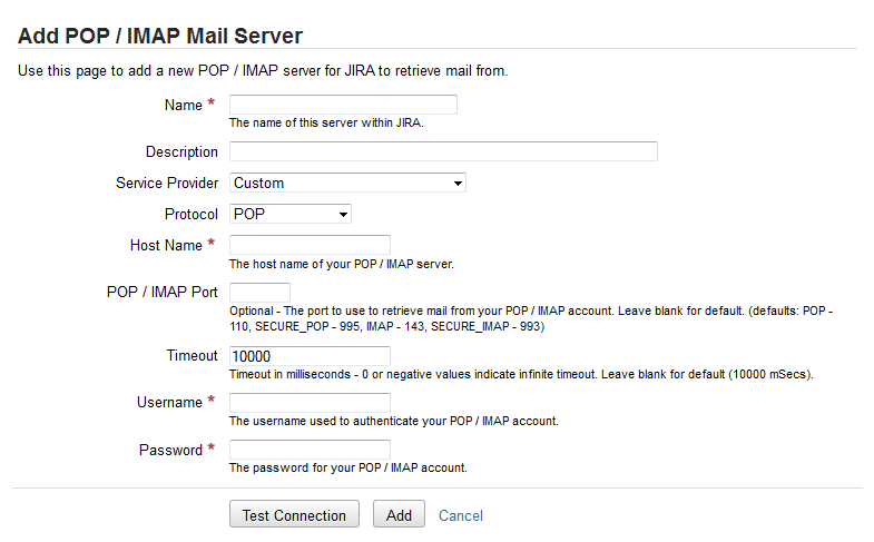 (Необязательно) Укажите период ожидания в миллисекундах, который обрабатывается как 10000, если это поле остается пустым. Указание 0 или отрицательное значение здесь приведет к тому, что JIRA будет бесконечно ждать ответа сервера POP / IMAP. |