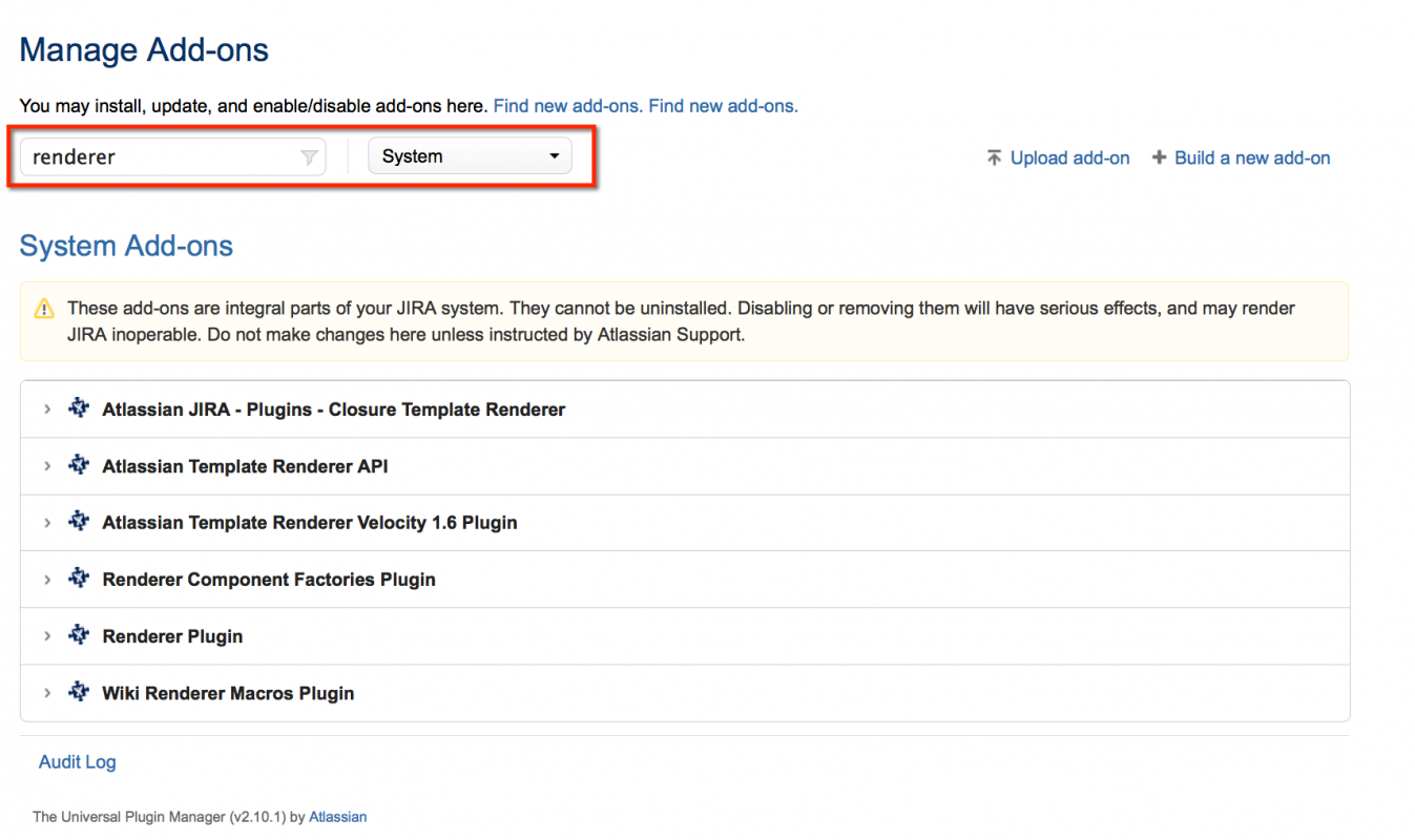 > Дополнения (Add-ons). Экран «Найти дополнения» (Find add-ons) показывает дополнения, доступные через Atlassian Marketplace. Выберите «Управление надстройками» (Manage Add-ons), чтобы просмотреть плагины, установленные на вашем сайте JIRA. - Выберите «Управление надстройками» (Manage Add-ons), а затем выполните поиск «визуализатора », фильтруя системные надстройки.