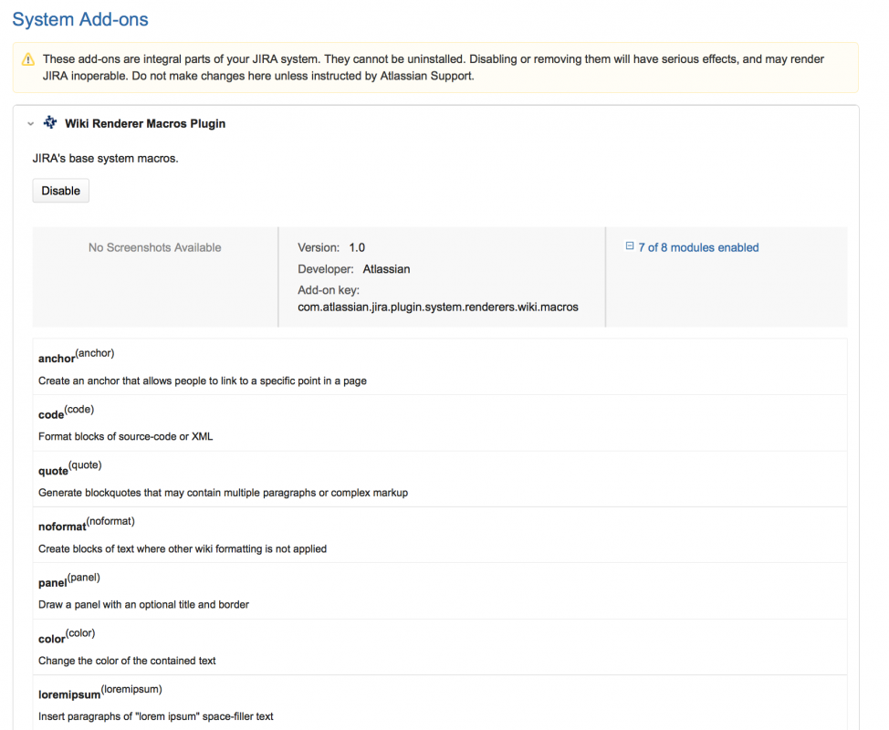 На этом экране вы увидите все сконфигурированные макросы в JIRA. Если макрос отключен, он не будет доступен для wiki-визуализатора. Если вы разворачиваете какие-либо дополнительные макросы, которые хотите использовать, они должны быть включены здесь для вики-визуализатора. Для получения дополнительной информации о написании плагинов см. «Документацию по написанию макросов».