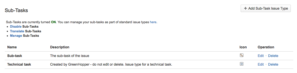 Для подзадачи должен быть определен тип подзадачи (который отличаются от стандартных типов задач). Обратите внимание, что в JIRA должен быть определен хотя бы один тип подзадачи, чтобы пользователи могли создавать подзадачи.