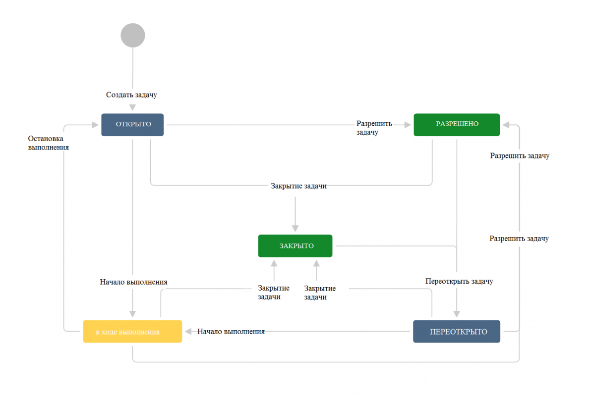 Переход - это связь между двумя статусами, которая позволяет задаче переходить от одного статуса к другому. Чтобы задача могла перемещаться между двумя статусами, должен существовать переход.