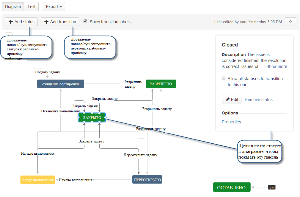 Связывает любые существующие задачи в вашем проекте с новым рабочим процессом.Теперь вы можете редактировать свой черновик рабочего процесса. Нажмите на статус или переход, чтобы просмотреть параметры редактирования на панели, которая появляется.