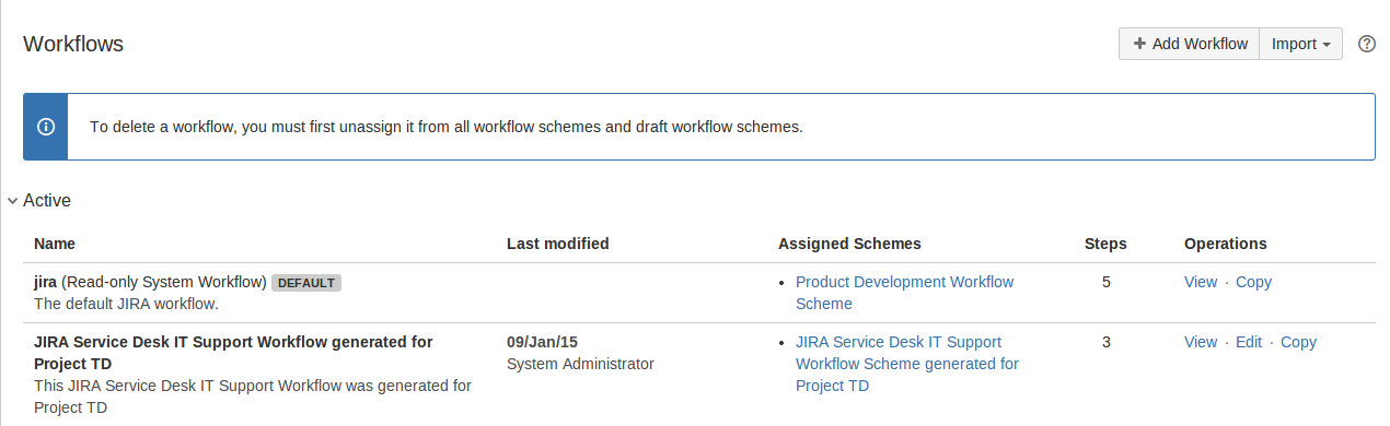 Всякий раз, когда вы создаете новый проект JIRA, ваш проект автоматически использует схему рабочего процесса по умолчанию. Схема связывает все доступные типы задач в проекте с рабочим процессом системы JIRA. Поскольку ни рабочий процесс системы JIRA, ни схема рабочего процесса по умолчанию не редактируются, JIRA создает редактируемую копию системного рабочего процесса и схемы рабочего процесса для вашего проекта.
