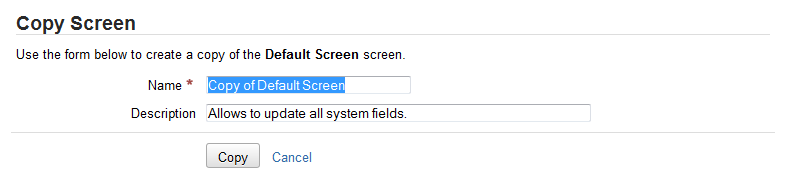 Нажмите ссылку «Копировать» (Copy) рядом с экраном, который вы хотите скопировать. Вы будете перенаправлены на страницу «Экран копирования» (Copy Screen), где вы можете ввести имя и описание для нового экрана: