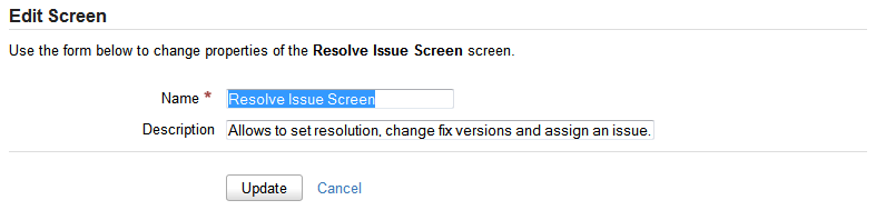 - «Связывание экрана с переходом рабочего процесса» (Workflow Transition) (например, «Разрешить задачу» (Resolve Issue)) - см. «Настройка рабочего процесса».