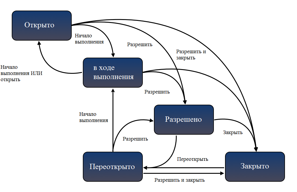 Рабочий процесс JIRA по умолчанию, показан переходами (стрелки) и шагами (синие поля):
