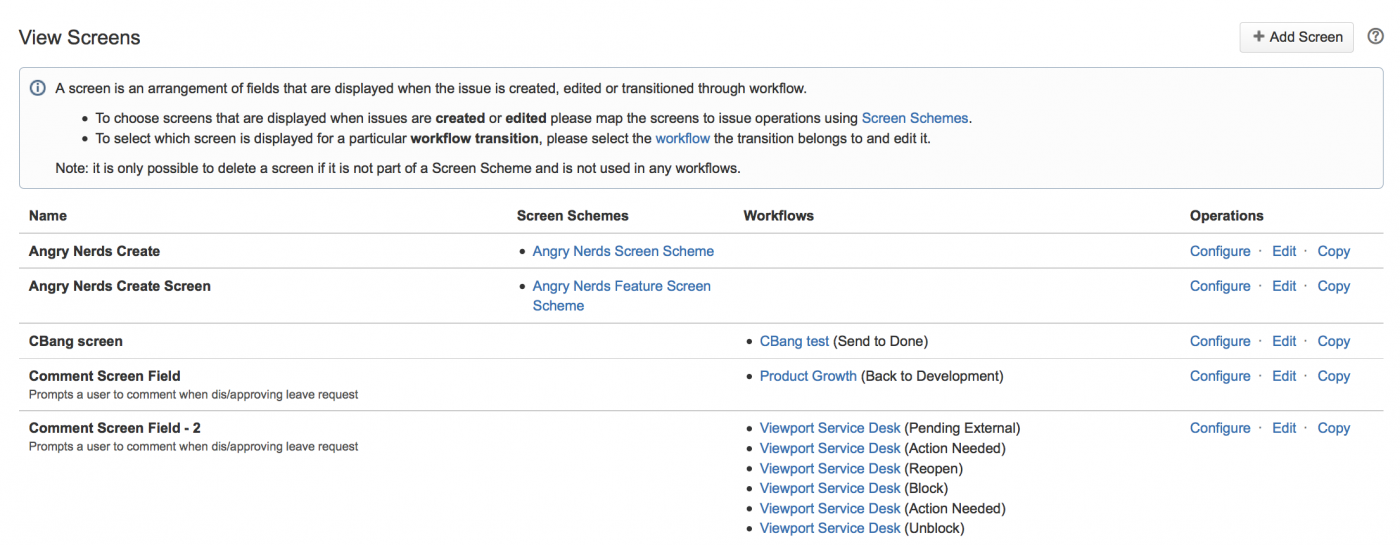 JIRA поставляется с экраном по умолчанию (Default Screen), экраном разрешения задач (Resolve Issue Screen) и экраном рабочего процесса (Workflow Screen), которые используются, как описано ниже: