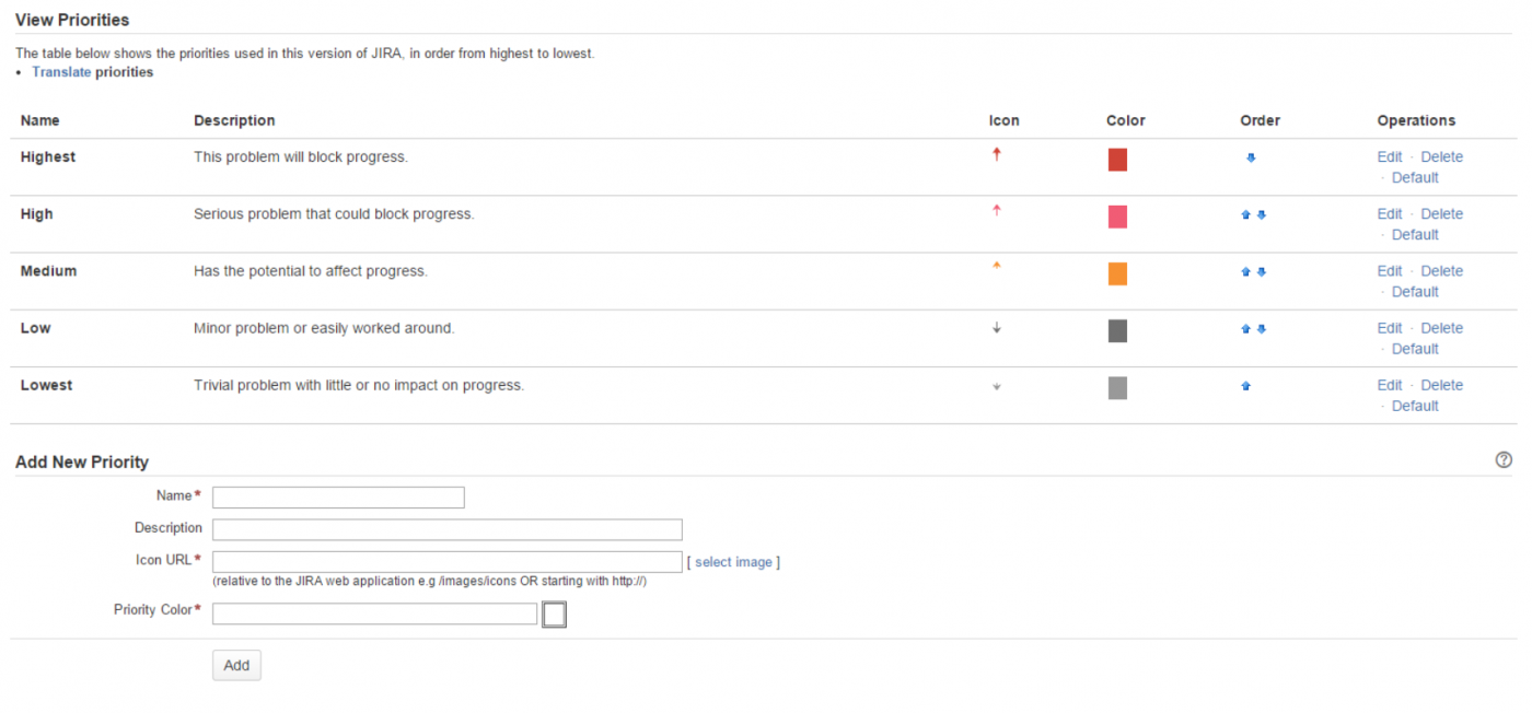 JIRA поставляется с набором приоритетов по умолчанию. Пользователь JIRA может изменить их или добавить свои собственные.