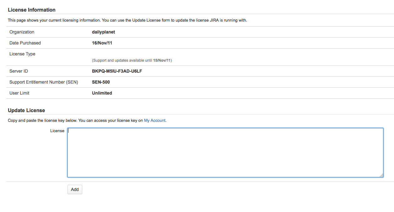 При создании лицензии JIRA пользователю будет предложено ввести идентификатор сервера JIRA. Как получить эту информацию пользователю от JIRA мы дадим рекомендации на этой странице.