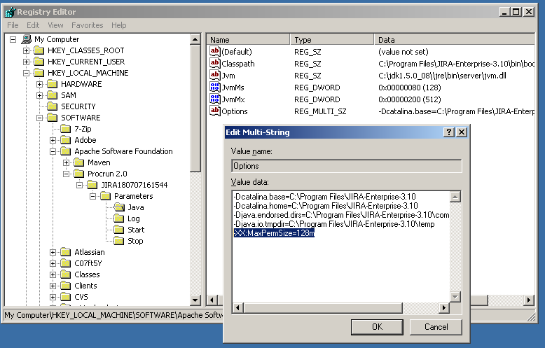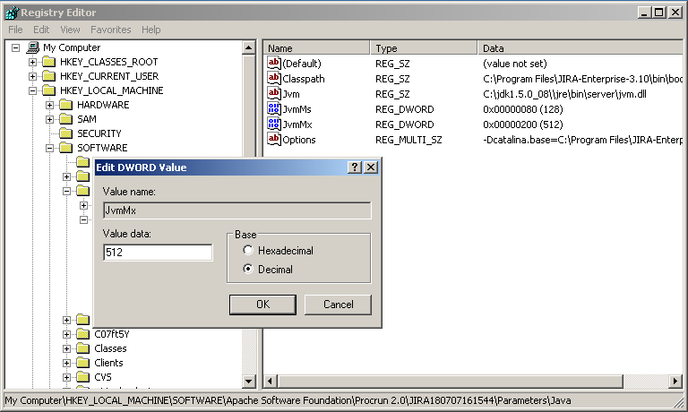 32-bit: HKEY_LOCAL_MACHINE > SOFTWARE > Apache Software Foundation > Procrun 2.0 > JIRA