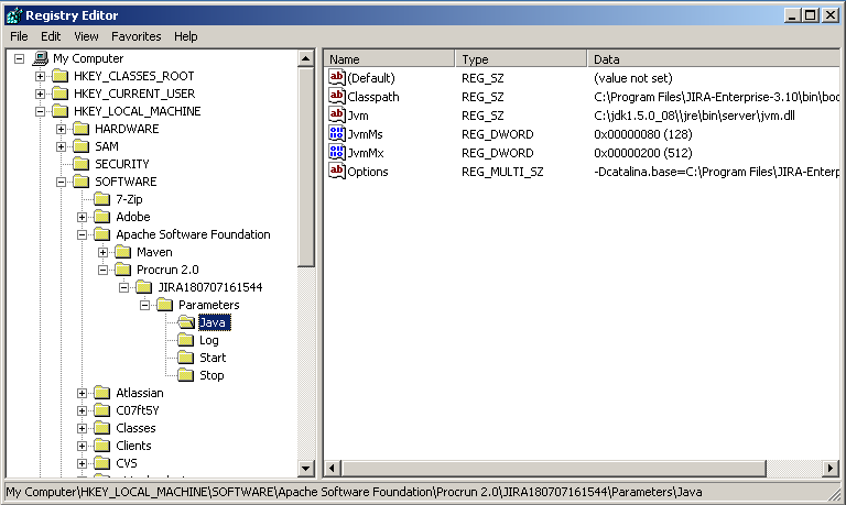 64-bit: HKEY_LOCAL_MACHINE > SOFTWARE > Wow6432Node > Apache Software Foundation > Procrun 2.0 > JIRA