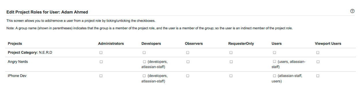 1. Чтобы просмотреть  роль пользователя в проекте, найдите пользователя в браузере пользователя (User) (см. «Просмотр пользователей выше») и нажмите ссылку «Роли проекта» (Project Roles) в столбце «Операции» (Operations). Это отобразит таблицу, показывающую все проекты и роли проекта, существующие в JIRA, и текущее членство в проекте для каждого проекта: