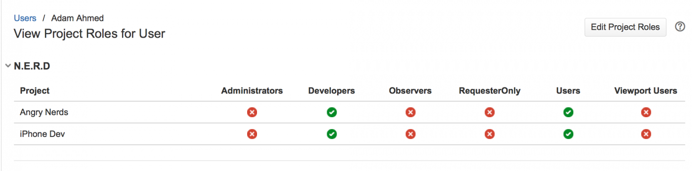 1. Нажмите кнопку «Изменить роль проекта» (Edit Project Roles). Затем флажки будут доступны для выбора (чтобы добавить пользователя к роли проекта) или очистить (чтобы удалить пользователя из роли проекта).