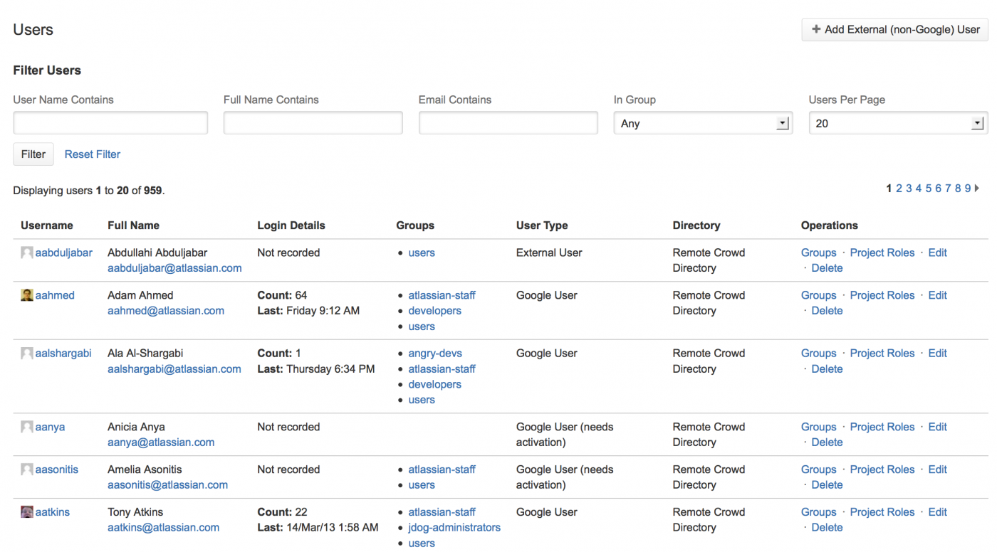 • JIRA не может обновлять внешних пользователей — например, пользователей, которые поступают с сервера LDAP или экземпляра Crowd — он может обновлять только пользователей, хранящихся во внутреннем каталоге JIRA. (Однако JIRA может обновлять пользователей JIRA, хранящихся в «Внутреннем каталоге с аутентификацией LDAP» (Internal Directory with LDAP Authentication).)