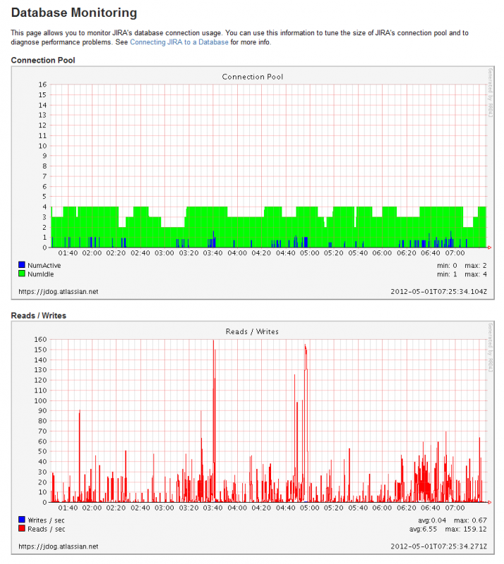 График «Reads / Writes» показывает частоту чтения и записи в базу данных в течение определенного периода времени. Может оказаться полезным сопоставить использование базы данных с использованием пула подключений. Всякий раз, когда JIRA необходимо получить доступ (т. е. читать или записывать) к базе данных, требуется подключение к базе данных. Если в чтениях / записи есть регулярные всплески, вам может потребоваться увеличить количество доступных в пуле максимальных соединений.