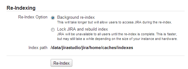 Опция фоновой повторной индексации должна использоваться в большинстве случаев, особенно после изменения конфигурации задачи. Как правило, фоновая повторная индексация занимает значительно больше времени, чем опция блокировки JIRA и перестройки индекса, но она позволяет JIRA оставаться пригодной для использования во время ее выполнения. Однако использование фоновой повторной индексации оказывает воздействие на производительность JIRA в целом. Рекомендуется использовать эту опцию в течение низкого периода использования. Фактическое влияние использования опции повторного индексирования фона будет зависеть от конкретной аппаратной и программной установки пользователя, а также от количества задач в системе.