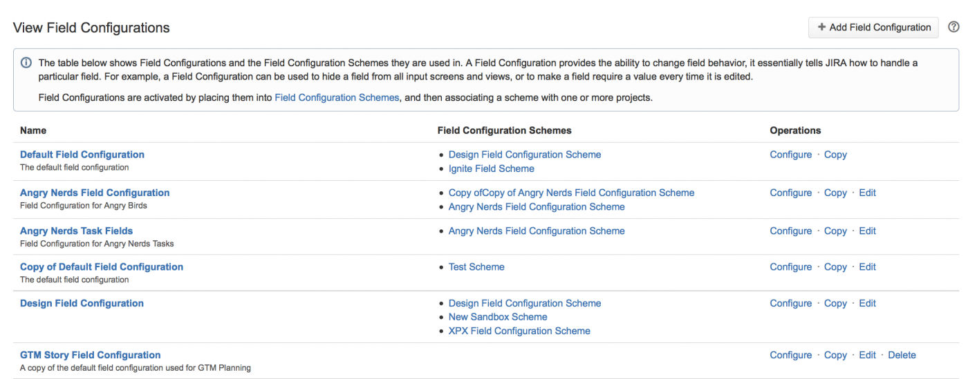 При определении поведения полей для одного или нескольких проектов JIRA и полей, используемых типами задач в этих проектах, вы обычно начинаете с добавления одной или нескольких новых конфигураций полей (см. ниже). Затем вы начинаете изменять поведение отдельных полей в этих новых конфигурациях полей.