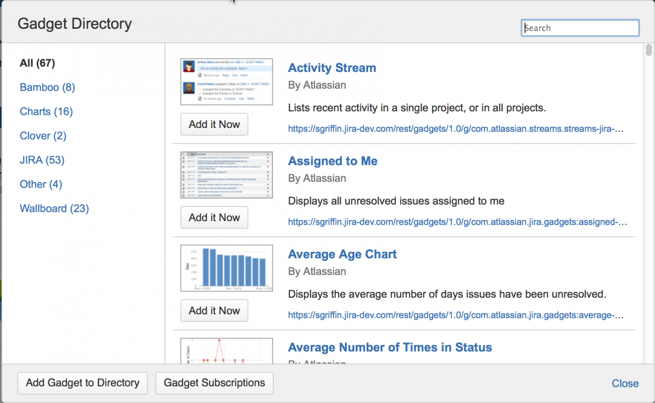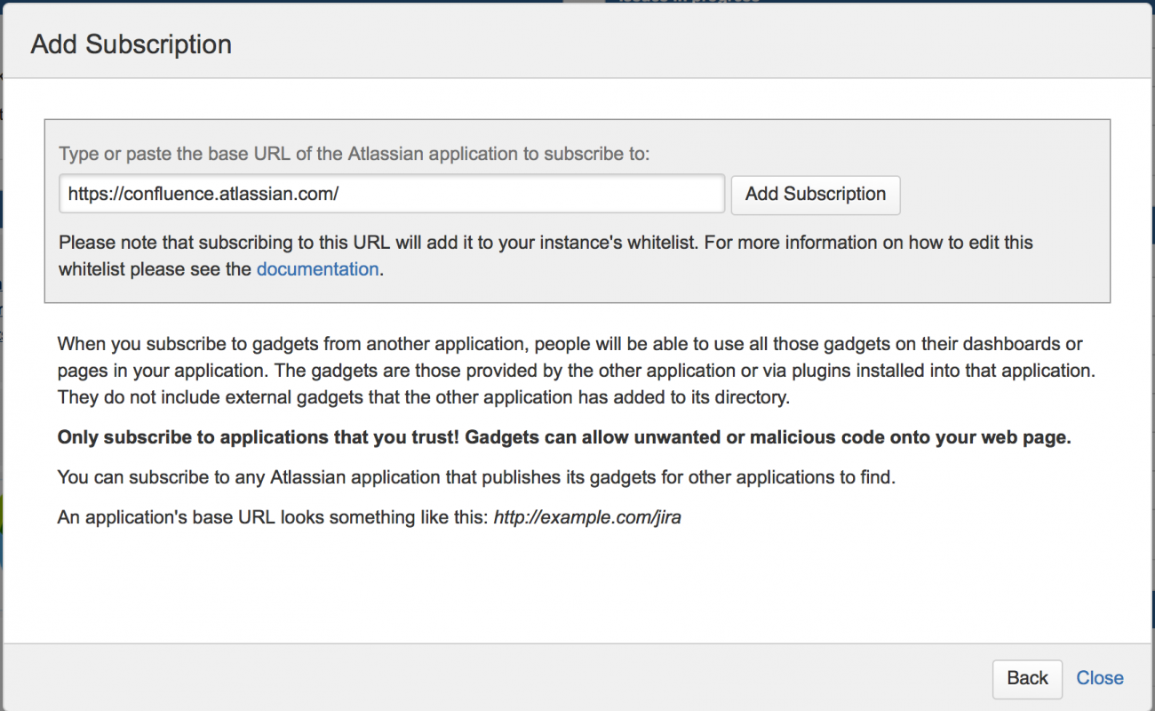 Если у вас есть права администратора, вы можете настроить приложение для подписки на гаджеты других приложений Atlassian. Эта функция позволяет администраторам делать все гаджеты из одного приложения доступными в другом приложении, без необходимости включать каждый гаджет отдельно через URL- адрес гаджета.
