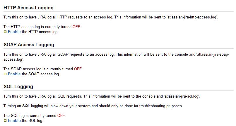 Обратите внимание: журналы доступа пользователя не выводятся в файл atlassian-jira.log, журналы http записываются в папку <JIRA Data> /log/atlassian-jira-http-access.log, а журналы SOAP записываются в <JIRA Data папка> /log/atlassian-jira-soap-access.log
