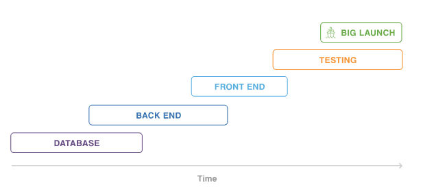 Ниже приведена иллюстрация стандартного проекта водопада (waterfall). Этот стиль разработки продукта объединяет все в один, «большой взрыв», релиз высокого риска. Как только проект проходит одну фазу, болезненно возвращаться к нему, потому что команды всегда стремятся к следующему этапу.