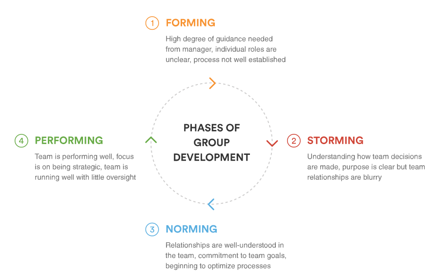 Когда команда сформирована, важно помнить, что agile команды похожи на отдельных людей: им нужно время, чтобы расти. Agile теоретики часто цитируют «стадии группового развития» Такмана. Agile команды проходят четыре ключевых этапа по мере своего развития.