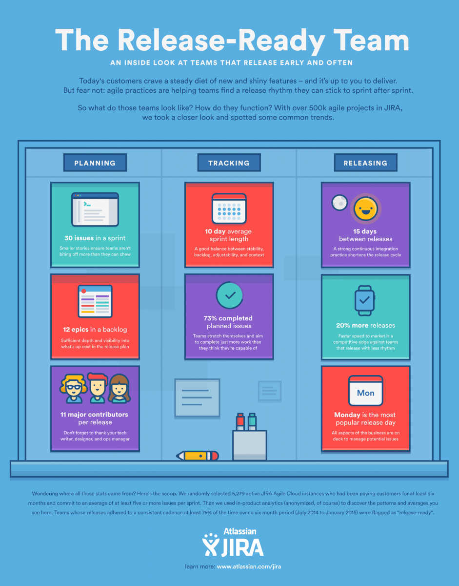 Поскольку надежные, согласованные выпуски релизов становятся все более и более важными для успеха команды разработчиков программного обеспечения (и выживания продукта), есть необходимость взглянуть на состав готовых к выпуску релиза команд. Имея более 500 000 активных экземпляров облака программного обеспечения Jira Software Cloud, мы обнаружили некоторые общие тенденции в командах, которые выпускали релизы с наибольшей согласованностью. Так что же нам сообщили данные? Смотрите сами в нашей инфографике о готовых к выпуску релиза командах.
