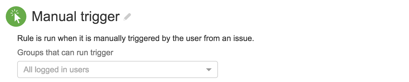 Этот триггер добавляет возможность вручную запускать правило со страницы просмотра задачи Jira. У вас также есть возможность ограничить группы, которые могут просматривать этот триггер.