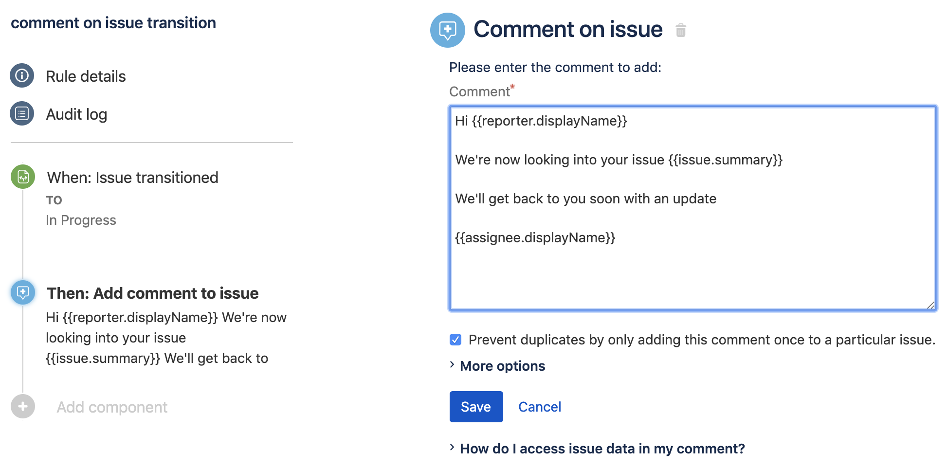 Давайте посмотрим на небольшой пример. Предположим, вы хотите добавить комментарий к задаче о передаче и адресовать докладчику и уполномоченному по задаче, которая была передана, по имени. Все, что вам нужно сделать, это вставить правильные интеллектуальные значения в соответствующие места в вашем комментарии: