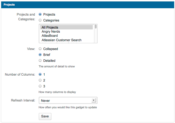 - «Проекты» (Projects) и «Категории» (Categories) — выберите один или несколько проектов (или «Все проекты» (All Projects)) для отображения в гаджете. (Примечание: «Категории» (Categories) будут отображаться только в том случае, если некоторые из них были определены в вашей системе JIRA.)