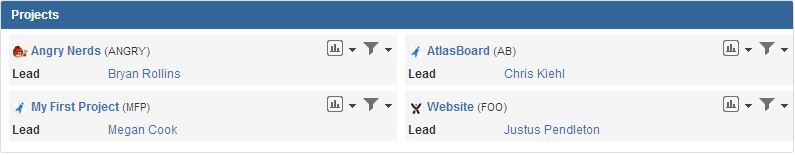 Гаджет «Проекты» (Projects) отображает информацию о выбранных ссылках и фильтрах, связанных с указанными пользователем проектами в JIRA.