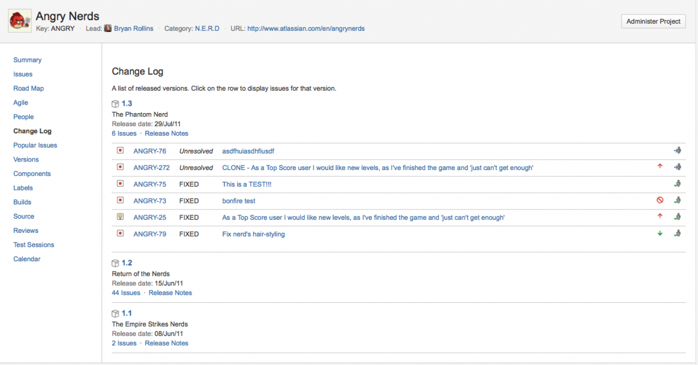 Отчет журнала изменений JIRA (Change Log) показывает разрешенные задачи в последних десяти выпущенных версиях проекта. В отличие от дорожной карты, в журнале изменений дается общий обзор задач, разрешенных в последних версиях.