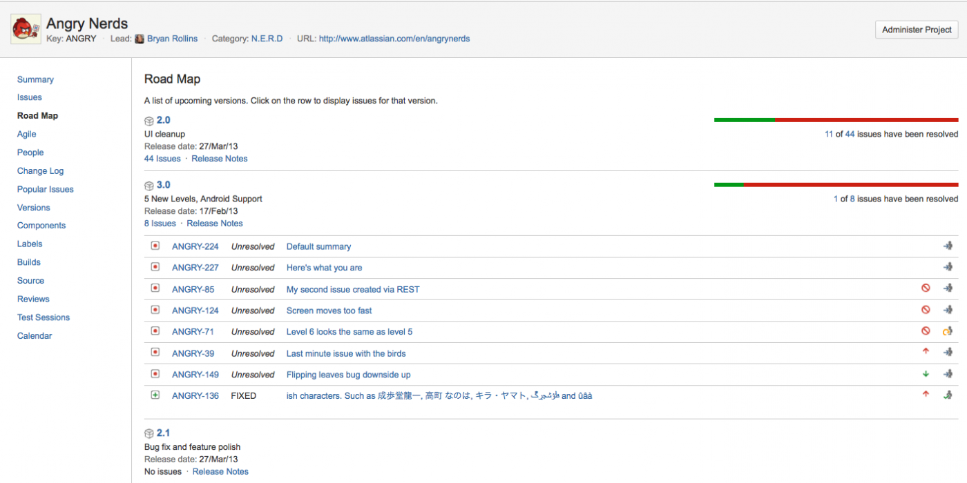 JIRA предоставляет отчет дорожной карты (Road Map) для каждого проекта, в котором перечислены задачи, запланированные для следующих десяти невыпущенных версий ((тогда как журнал изменений показывает только выпущенные версии). Отчет «Дорожная карта» (Road Map) содержит обзор прогресса, достигнутого в направлении выпуска версий; поэтому версии отображаются в противоположном порядке, как они отображаются на экране «Версии» (Version) для проекта.