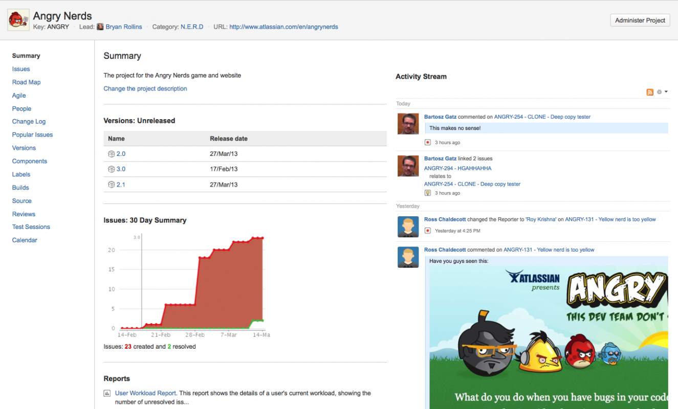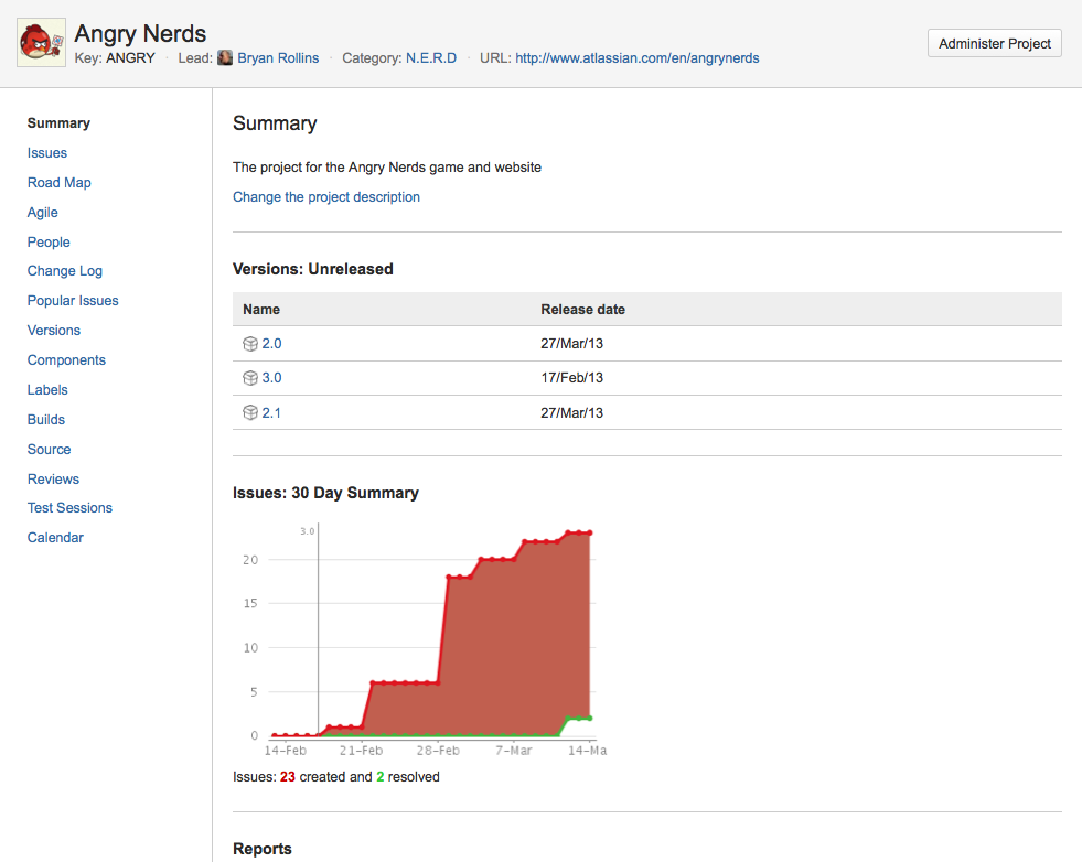 Страница «Сводка» (Summary) для проекта в JIRA показывает недавнюю активность в проекте, а также список версий и задач, которые должны скоро появиться.
