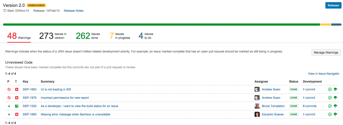 Страница «Выпуск» (Release) для версии показывает прогресс вашей версии, поэтому вы можете определить, какие задачи могут отгружаться в первую очередь. Если у вас есть JIRA, связанная с вашими инструментами разработки, страница выпуска также предупредит вас о потенциальных задачах разработки, которые могут вызвать задачи для вашей версии.