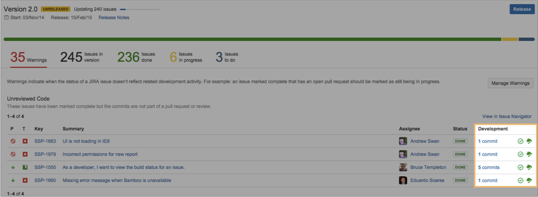 Эти предупреждения на этой вкладке сообщают вам, когда ваши данные о задачах потенциально не синхронизируются с вашими данными разработки. В зависимости от того, какие средства разработки подключены к JIRA, на странице Release будут отображаться следующие предупреждения: