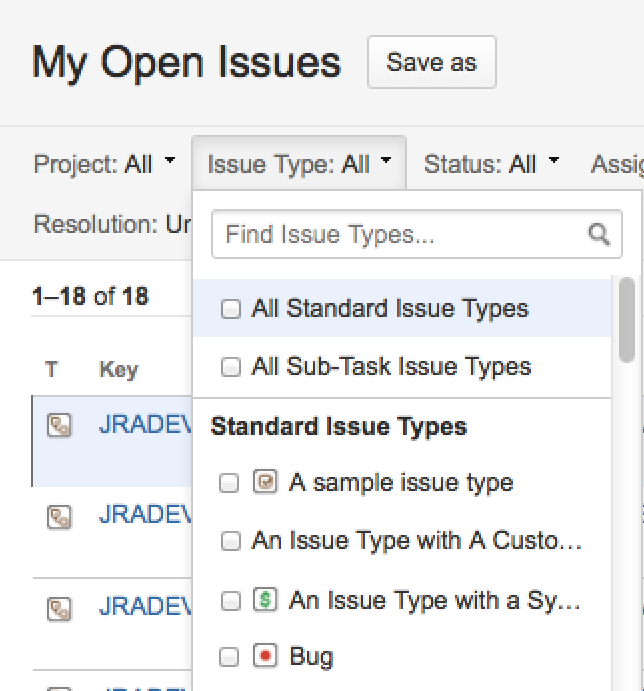 Если подзадачи включены, в раскрывающемся списке «Тип задач» (Issue Typeформы поиска отображаются две дополнительные записи.