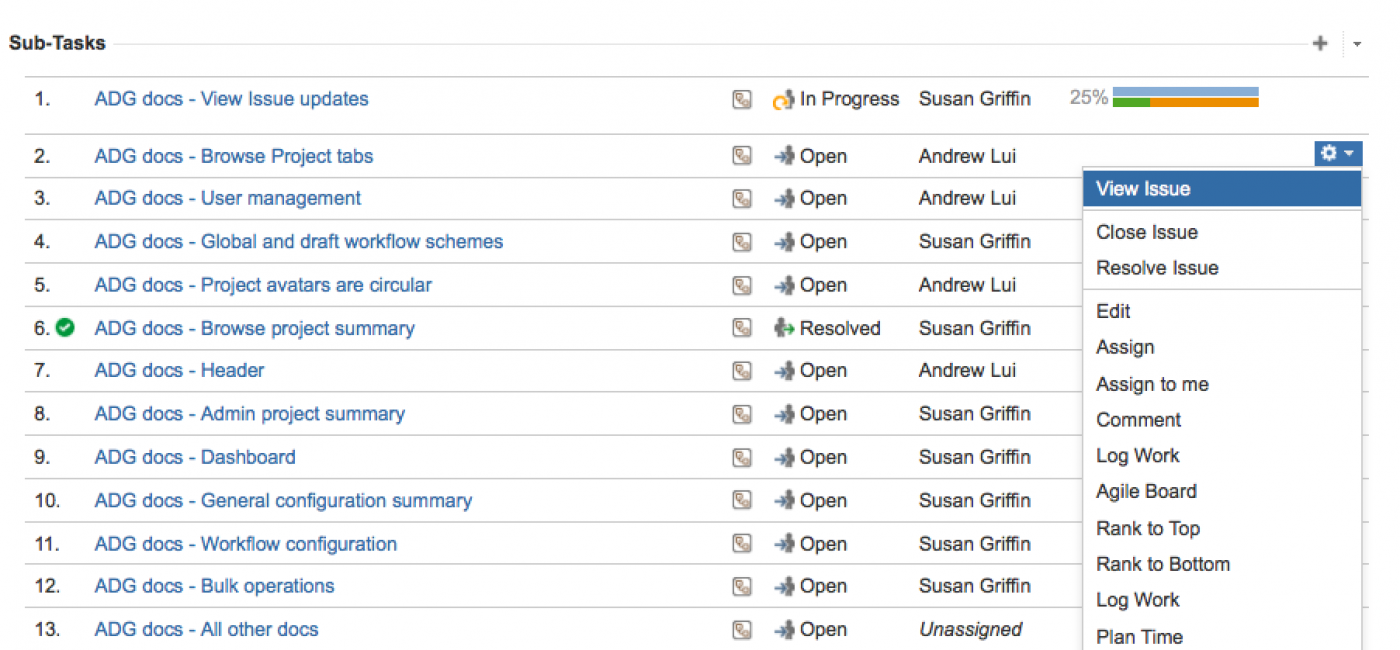 Подзадачи имеют все те же поля, что и стандартные задачи, например, резюме, описание, репортер, правообладатель, статус. Обратите внимание, что подзадачи имеют разные типы задач из стандартных типов задач.